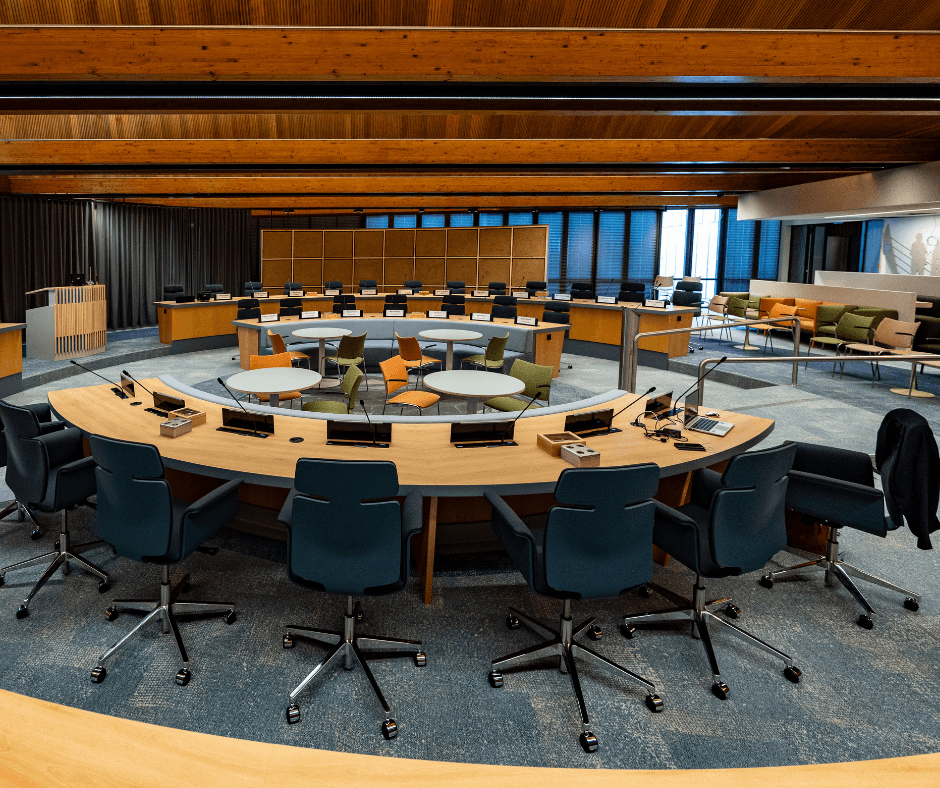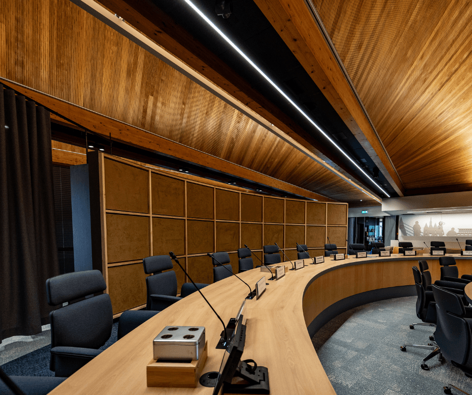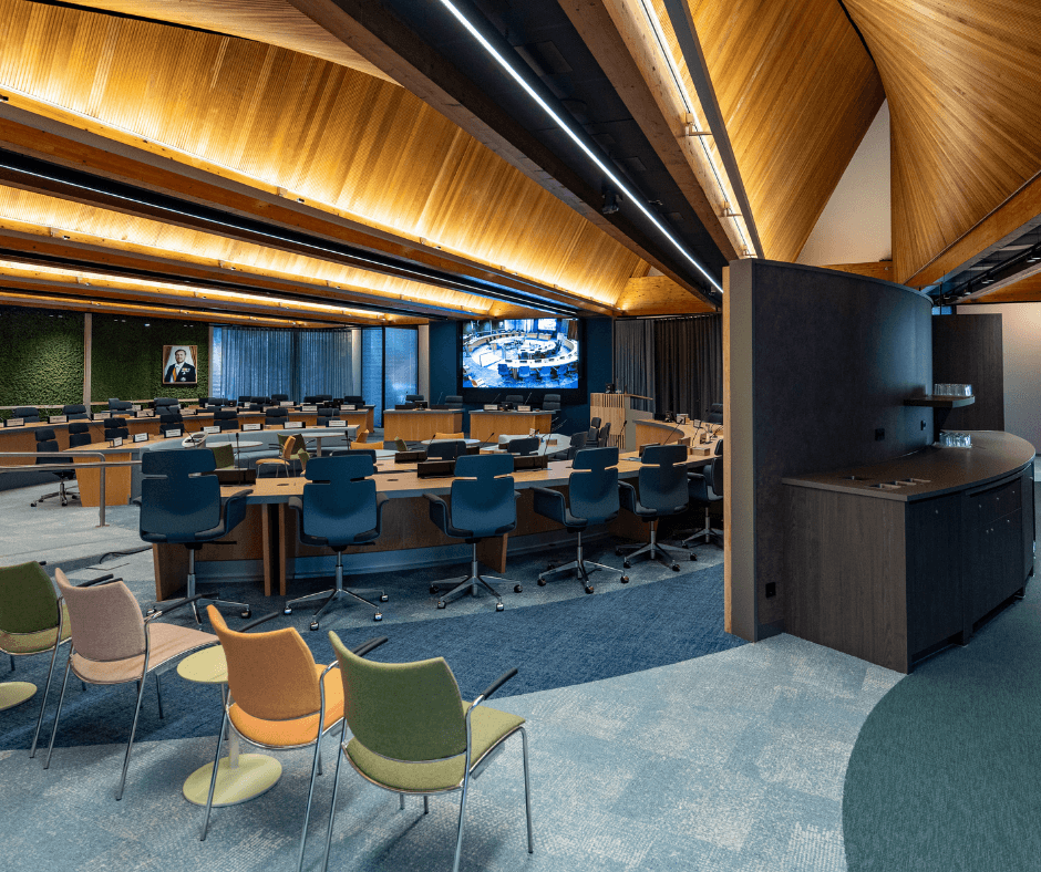- Een compleet nieuw vergadersysteem geïnstalleerd voor beter geluid tijdens vergaderingen en uitzendingen;