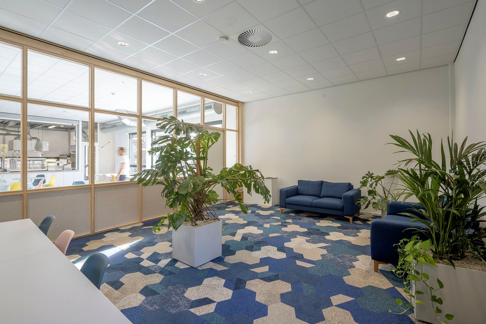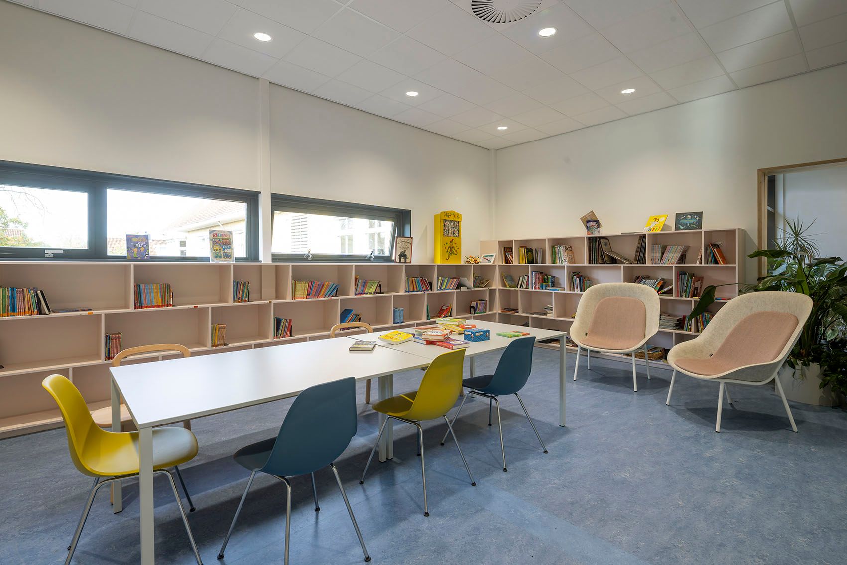 Bij het Orion College Noord hebben wij de aula, de bibliotheek en de werkruimtes verbouwd. Er zijn nieuwe houten binnenpuien en metal-stud wanden gemaakt. En berken mulitplex en PETfelt wandbekleding. De verlichting is veranderd naar LED-verlichting en de W-installatie zijn aangepast. Ook staat er nu nieuw maatwerk-meubilair.